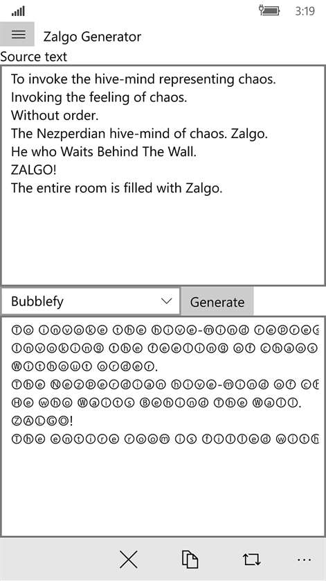 Zalgo text is text with special characters inserted that let it appear evil and corrupted. Invoking the feeling of chaos. Zalgo text generator online to convert any text into zalgo font. Zalgo text generator help to change your text to zalgo text style means your given text show on different heights some places show you is fallen or messed up of the parts of your character. Scary text for facebook, instagram, twitter.